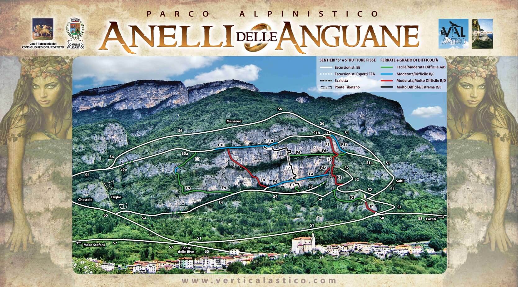 Gli itinerari si combinano formando 8 Anelli principali, con varianti che portano a oltre 15 possibili percorsi. Il tempo medio varia dalle 2,5 ore degli anelli più brevi alle 6 ore del Grande Anello delle Anguane, uno dei giri attrezzati più lunghi e impegnativi delle Prealpi.