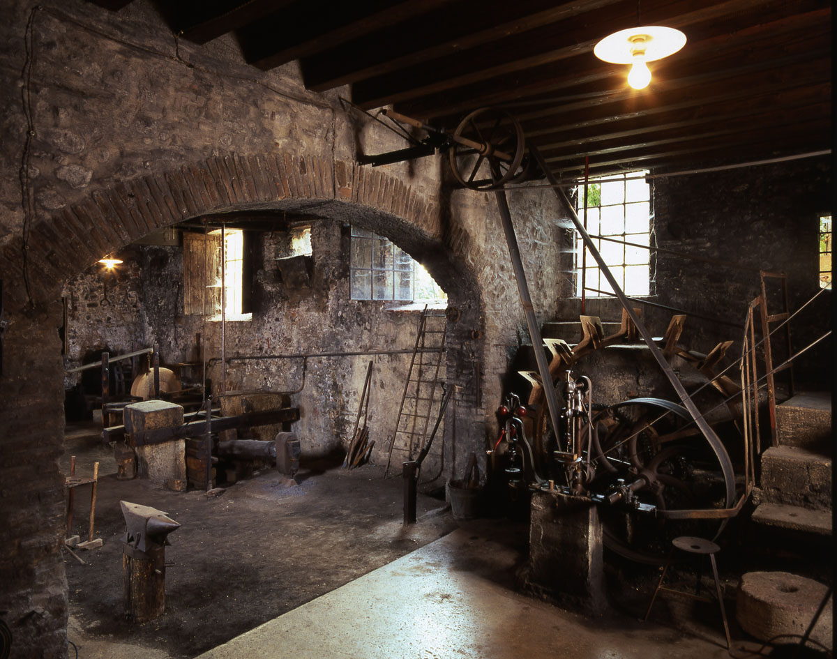 Scendere i pochi gradini che conducono all’officina significa entrare in una dimensione sospesa, dove la penombra delle pareti annerite dal tempo e il suono delle pale sull’acqua avvolgono il visitatore in un’atmosfera autentica, viva, vibrante.