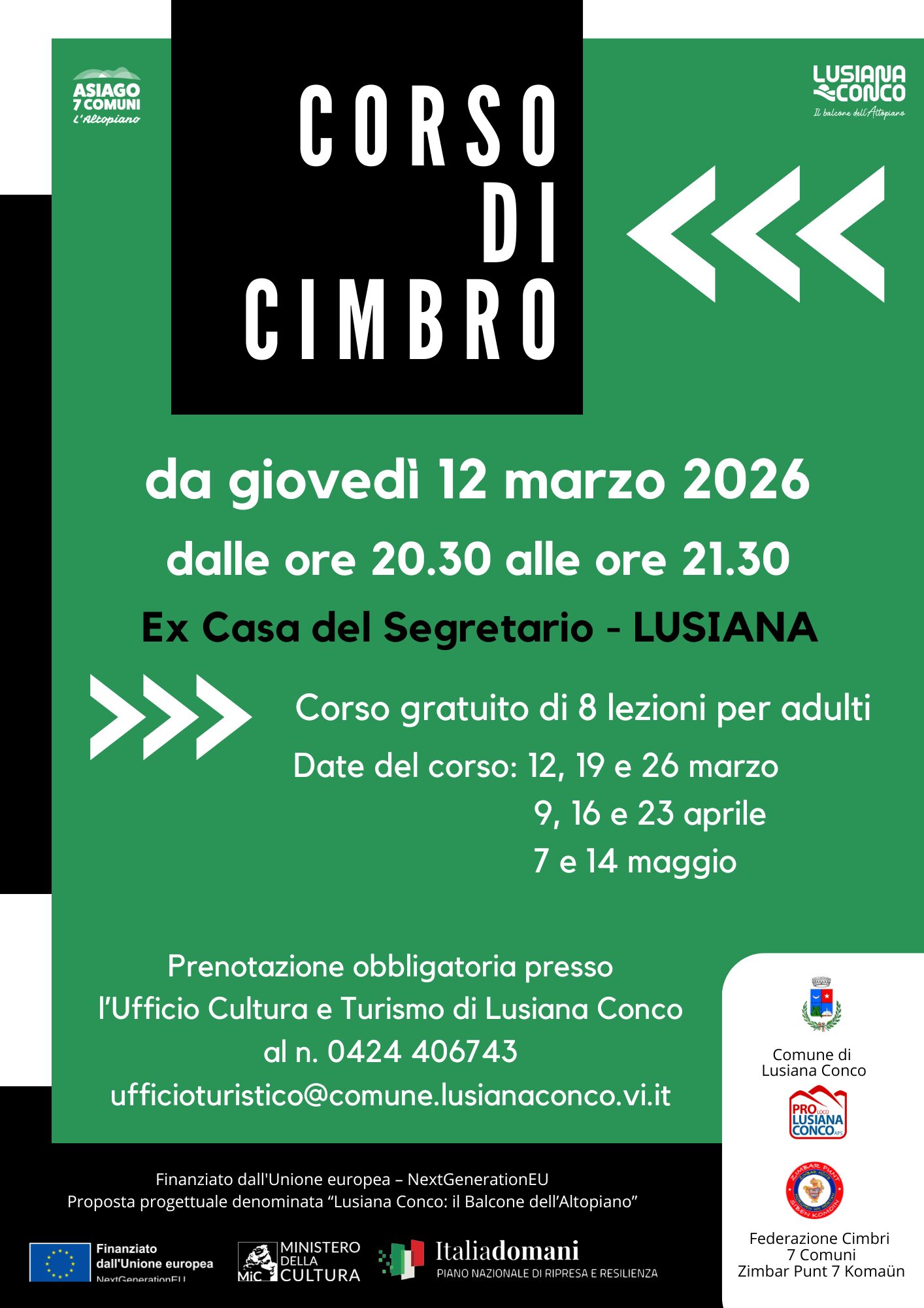 Giovedì 2 marzo alle ore 20.30, presso l’Ex Casa del Segretario a Lusiana, si terrà il CORSO DI CIMBRO. Corso gratuito di 8 lezioni per adulti. Date del corso: 12, 19 e 26 marzo / 9, 16 e 23 aprile / 7 e 14 maggio.