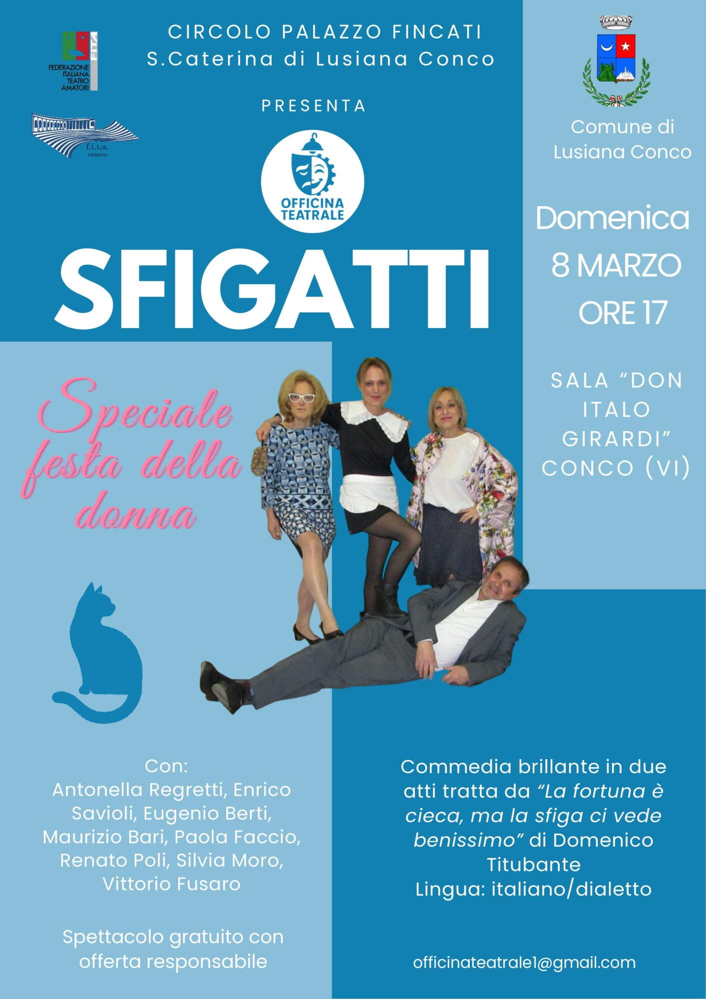 Domenica 8 marzo alle ore 17.00, presso la Sala “Don Italo Girardi” a Conco, si terrà SFIGATTI.SPECIALE FESTA DELLA DONNA, commedia teatrale a cura del Circolo Palazzo Fincati.