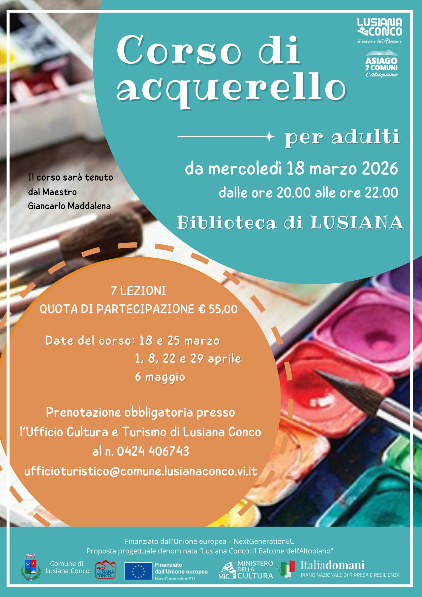 CORSO DI ACQUERELLO. Corso di 7 lezioni per adulti. Date del corso: 18 e 25 marzo / 1, 8, 22 e 29 aprile / 6 maggio. Quota di partecipazione € 55,00. Prenotazione obbligatoria presso l’Ufficio Cultura e Turismo di Lusiana Conco al n. 0424 406743, ufficioturistico@comune.lusianaconco.vi.it