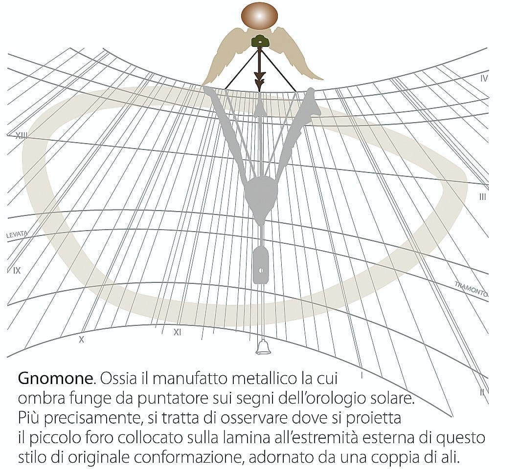 Una legenda riporta altre ad indicazioni utili alla lettura dell’orologio solare: la latitudine, la longitudine, la declinazione magnetica e l’altezza sopra il livello del mare e altre ancora.