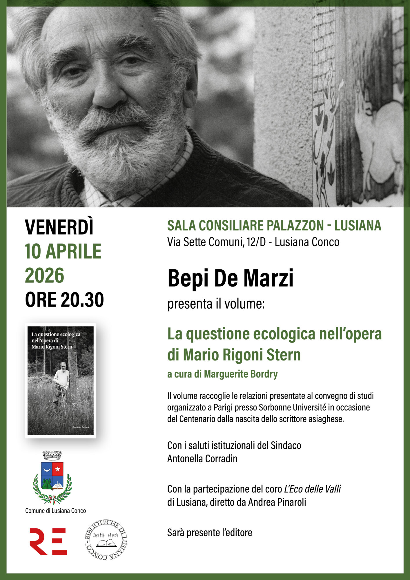 La questione ecologica nell’opera di Mario Rigoni Stern. Presentazione del volume di Marguerite Bordry che raccoglie le relazioni presentate al convegno di studi organizzato a Parigi in occasione del Centenario dalla nascita dello scrittore asiaghese, a cura di Ronzani Editore. Presenta Bepi De Marzi, con la partecipazione del Coro L’Eco delle Valli di Lusiana