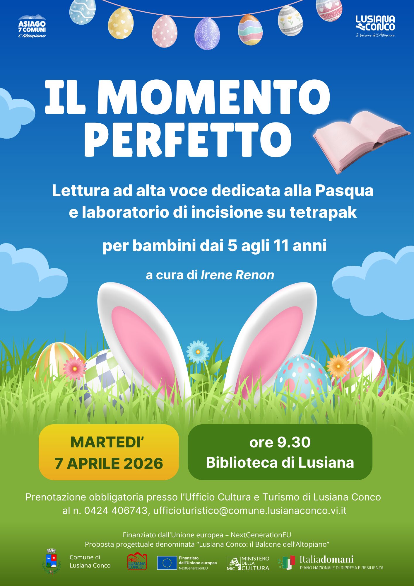 IL MOMENTO PERFETTO. Lettura ad alta voce dedicata alla Pasqua e laboratorio di incisione su tetrapak per bambini dai 5 agli 11 anni, a cura di Irene Renon. Prenotazione obbligatoria presso l’Ufficio Cultura e Turismo di Lusiana Conco al n. 0424 406743, ufficioturistico@comune.lusianaconco.vi.it