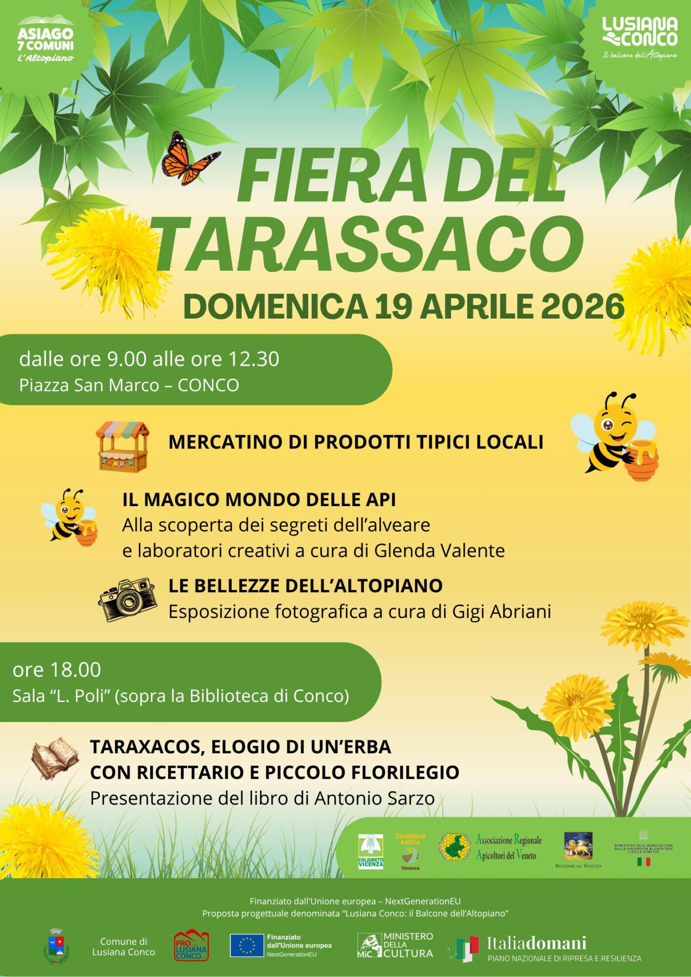 FIERA DEL TARASSACO. Mercatino di prodotti locali, laboratori creativi alla scoperta dei segreti dell’alveare, esposizione fotografica “Le bellezze dell’Altopiano”. Il programma completo è consultabile sul sito www.visitlusianaconco.it